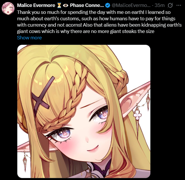 >Thank you so much for spending the day with me on earth!https://x.com/MaliceEvermore/status/2016898789798531403