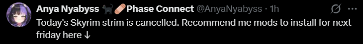 Anya's stream is cancelled. She will play Skyrim with mods and she is asking for suggestions.https://x.com/AnyaNyabyss/status/2017376073495839140