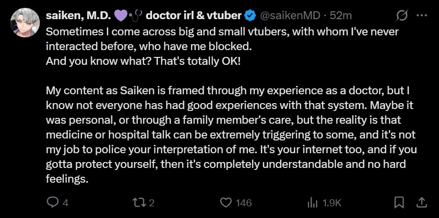 >>108996689I think it gives him an excuse, he can say "big vtuber has me blocked because they find doctors triggering" instead of "because I'm comment on every female vtuber's half-naked cosplays"