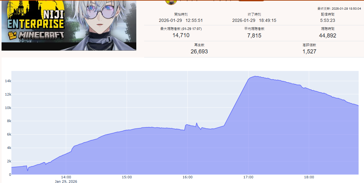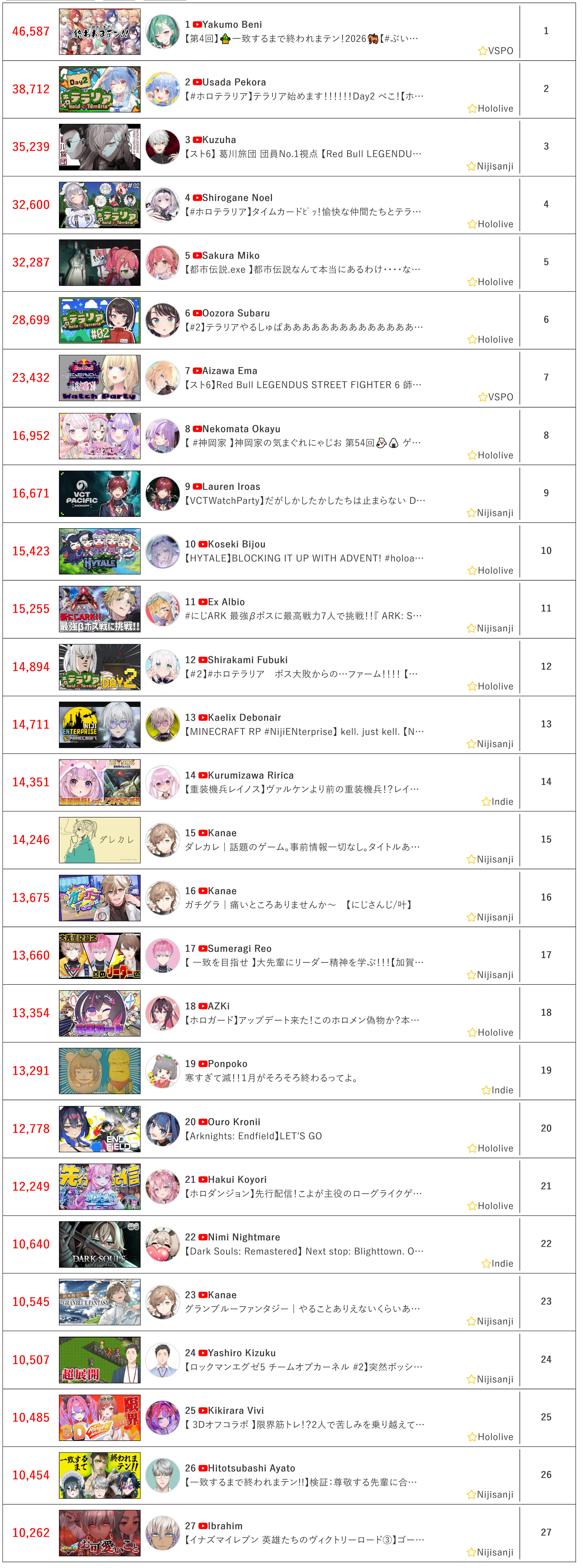 *JANUARY 29TH 2026 FINAL EN TALLY*>15,423: Bijou (Hololive English)>14,710: Kaelix (Nijisanji English)>12,778: Kronii (Hololive English)>10,640: Nimi (Indie)>7,629: Nerissa (Hololive English)>7,430: FUWAMOCO (<3) (Hololive English)>6,149: Calliope (Hololive English)>6,043: Vox (Nijisanji English)>5,613: FUWAMOCO (<3) (Hololive English)>5,446: Shiori (Hololive English)>5,354: Kiara (Hololive English)Beefy tally but for all the wrong reasons. Gold for Koseki Bijou's playthrough of Hytale alongside Advent, Silver for Kaelix's playthrough of Minecraft (check his graph if you wanna have a laugh), Bronze for Ouro Kronii's playthrough of Arknights Endfield.>RANKING PER POINTS (Gold = 3, Silver = 2, Bronze = 1)Bijou = 36pIRyS, Calliope = 18pKronii = 17pGigi = 12pMeloco, Saba = 11pRaora = 8pIna'nis = 7pFUWAMOCO, Nimi = 6pShiori, Cecilia = 4pZotto, Seible = 3pNerissa, Kaelix = 2pMint, Kiara, Baelz = 1pKOSEKI BIJOU WINS THE MONTH OF JANUARY BY POINTS.