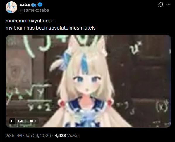 here's your health updatehttps://x.com/samekosaba/status/2016958491110297726