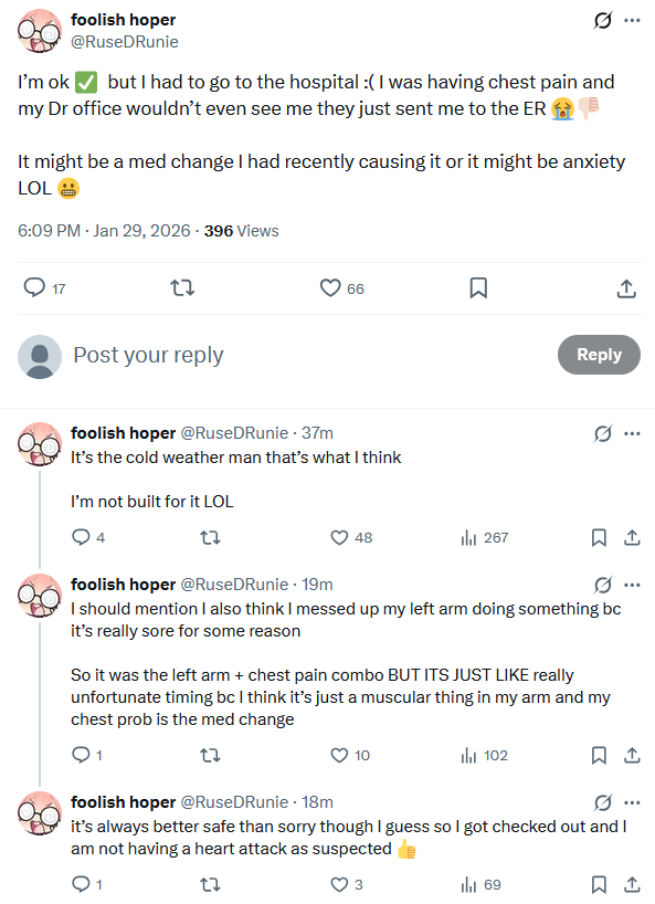 >>108999481I think symptoms and causes may be getting confounded, but she was certainly much softer and open today. it was nice.