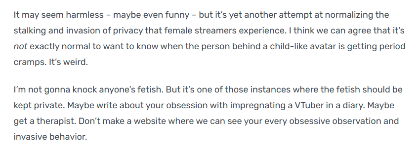 >>109001688Have you considered that you're not REQUIRED to share with the world when you're on your period?You're comparing following people around in public vs people who willingly shout at the town square about their current status.
