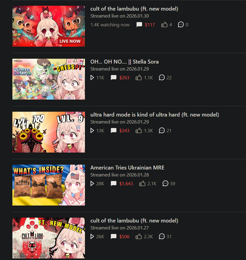 >>109002843>I did think a site did that actually.As far as I could tell, none keep track of bits, and sure as shit don't scan streams for stream elements/labs donos. But like other dude said, youtube is her primary platform. Twitch is mostly a handful of people dropping subs or prime given how she'll go months without streaming on it at a time.