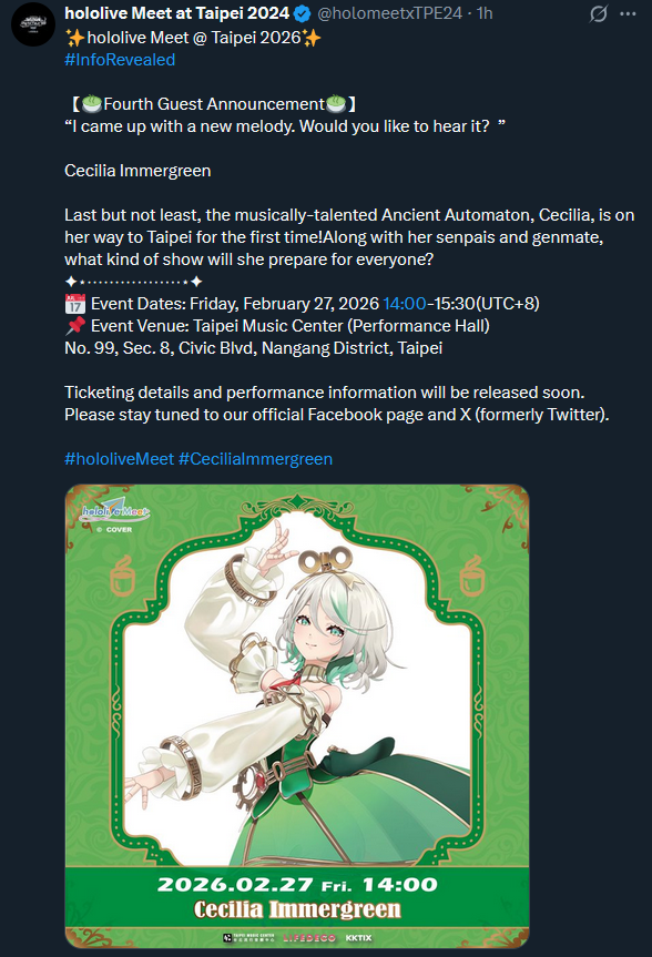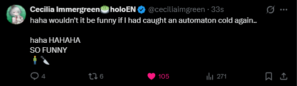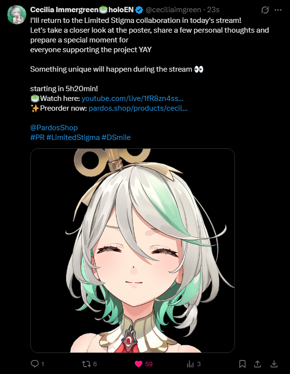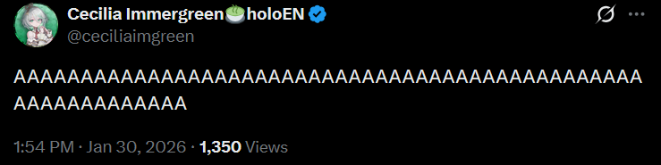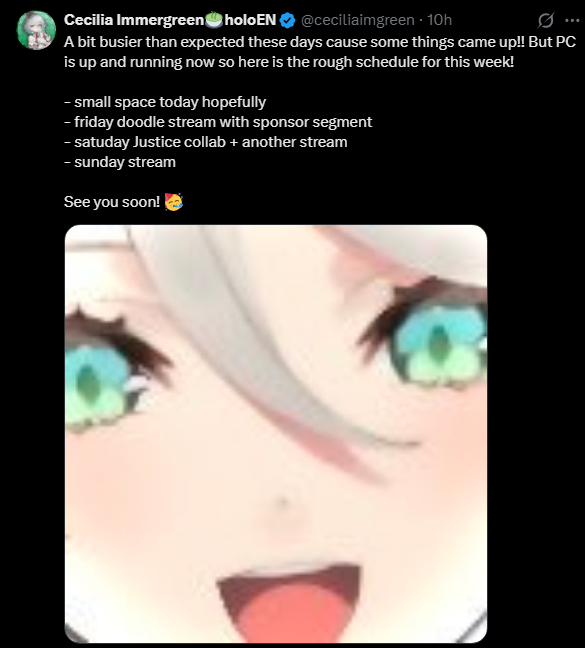 The 694th Wind>NEXT STREAM: Friday doodle streamLink pending>LAST STREAM: QUICK UPDATES AND SAYING HI!!!! RLY FAST RLY SHORT!!!https://x.com/gigimurin/status/2016513350394655164>Links:YouTube: https://www.youtube.com/@holoen_ceciliaimmergreenTwitter: https://twitter.com/ceciliaimgreenImportant Videos: https://rentry.org/ImmerMarks>Music:https://rentry.org/ImmerPiece【Hololive EN Justice】ABOVE BELOW- https://www.youtube.com/watch?v=ilLEj-SCCn8【Cover】 Forgotten Words | 忘れじの言の葉 #歌ってみた - https://www.youtube.com/watch?v=twto2g0FwTQ【Hololive EN】Odyssey - https://www.youtube.com/watch?v=0wO8d70KSXw【ENReco Orisong】Oh Princess - https://www.youtube.com/watch?v=5x9ix5CGmoo【CCGG Cover】Naimononedari / ないものねだり - https://www.youtube.com/watch?v=Qq-fgjrc-uc【CCGG Cover】Turing Love / チューリングラブ - https://www.youtube.com/watch?v=hX_3P0TBGP4【Hololive EN】 All for One - https://www.youtube.com/watch?v=ok24HgzbeLs【Hololive EN Justice】RENEGADE - https://www.youtube.com/watch?v=xg6DUmRRXlw【Cover】nevermore / ネヴァモア -https://www.youtube.com/watch?v=FZkkGB2bUyo【Original Song】Wind-Up - https://youtube.com/watch?v=Kqh6-vjars8>Merch:https://rentry.org/ImmerMerchHoloPro: https://shop.hololivepro.com/en/collections/ceciliaimmergreenGeekJack: https://shop.geekjack.net/pages/hololive>Tags:#ImmerScreen (Stream) https://twitter.com/hashtag/ImmerScreen#Immergination (Art) https://twitter.com/hashtag/Immergination#ImmerPiece (Music) https://twitter.com/hashtag/ImmerMusic#ImmerMemes (Memes) https://twitter.com/hashtag/ImmerMemes>/grün/ OP Template:https://rentry.org/ImmerTemplate>Previous Thread: >>108965510