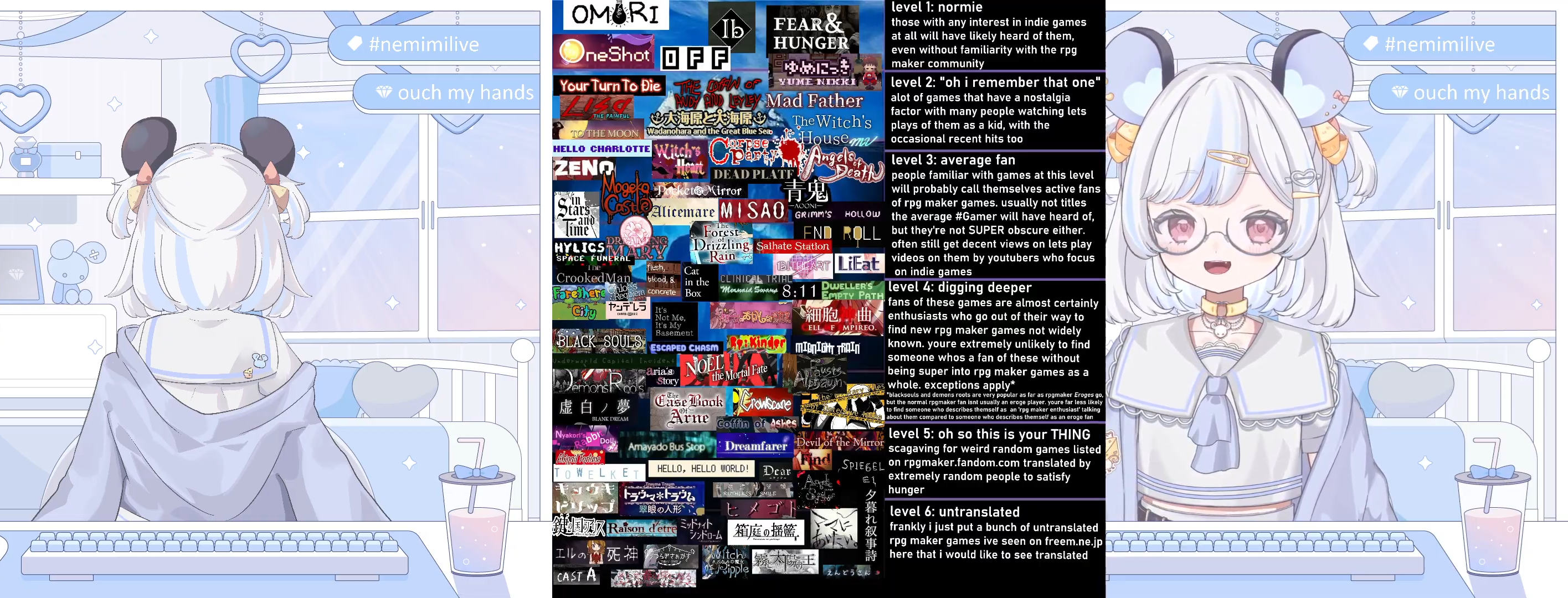 >>109048127>>why so glasses?>can a girl not be glases? is this illegal??>i played this as a kid and i know i got all endings as a kid>i fear i might not be as good as puzzle as little mimi was>my cat is screaming... annoying creature... it's Gouda. Brie does really scream anymore >i only remember to take my vitamins when i stream cause there on my desk>i played a lot of RPG maker games when i was little, i dont remember most of them >i am really really really normal about a character in this game in a really normal way>saw an iceberg/tierlist that i thought made sense>the top row except for ib i havent played and some of those i knew because they had yaoi ships but i did not play them cause i was like, all you guys want to do it see boys kiss and i need more substance to my yaoi!>...cause i was annoying! and i was 12>i've never used tumblr, was not allowed and it confused me>i was like this is odd what is an HTML how do i make it look cool? also i didnt have a computer i made a tumblr on my phone and it was ugly and scary and really hard to edit it>we nee hidden rivalries but for other sports>can i speak my truth? i didnt like hidden rivalries... i thought the writing was bad, the guys are sexy i guess is the point? but it's hot men slop... my expectations were too high i think >i dont really like 3D either... i was like eww they're so human.. so fleshy.. i dont want to see it>i feel like im simple, they had all the women comment on Leon Kennedy and something in my brain goes he is kinda cute isn't he... i think they kinda cooked... and i dont even like that type of guy! but i could be convinced >hidden rivalries guys make me uncomfortable in a way leon doesnt>i hate to say it but men should be a little chubby, they have leon looking like he has 0% body fat >anyways i think i should say hi to people...>leave me aloooone!! can a girl not have opinions?? is it illegal?>even the lenky gamer guy stereotype, he doesnt eat well so he probably has a bit of a pudgy belly right? it's cute!! ..is it not?>wanyways whatever *finally says her hellos*>i have a bad habit of buying cute stickers and stationery and never using it, a big goal for 2026 is to use stuff like that>OBS is having a moment.. PC could use an upgrade but i fear it's never gonna happen at this point>>did you look into having a 2nd miniPC?>i did, an oomf suggest some>gonna be a disembodied voice for a bit, here... you can look at this *turns her back to dormies* >had a RAM issue last year and i wanted to get beautiful pretty RAM>*dealing with OBS and stuffs*>>wani: OMG UR PLAYING MY FAVORITE GAEM>hi wani! omg what teh heck there's women here... and im having tech issues... im scared of the women>im gonna lose it, i dont wanna restart streeeeaaammmuh