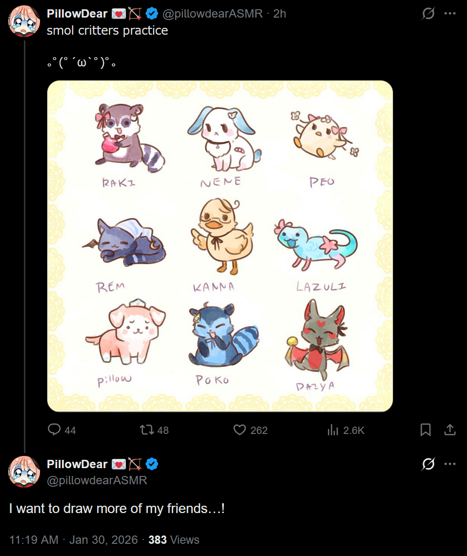 >Her friends (non-inclusive): Essie_ch (her oshi), Krumroll, Kibawoo, Kikitchiwi (french), Miaelou (french), Rimaeri, Gloomi