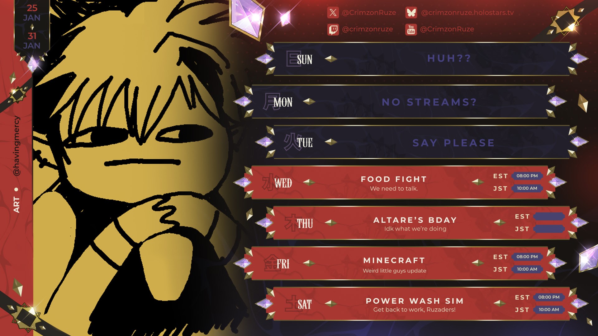 Crimzon Ruze Ch. HOLOSTARS-EN 5 hours ago>Guerilla week, gamers. o7 Don't ever sleep, don't move. Watch for my going live notificati-AH, hold on. Did you just blink? No more of that. >Just ruminate in your own stench or whatever until I go live.