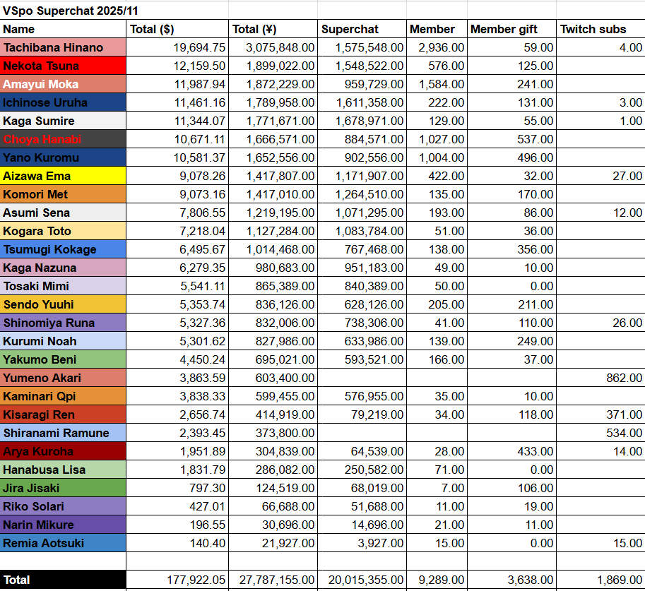 VSPO superchat numbers for Nov 2025