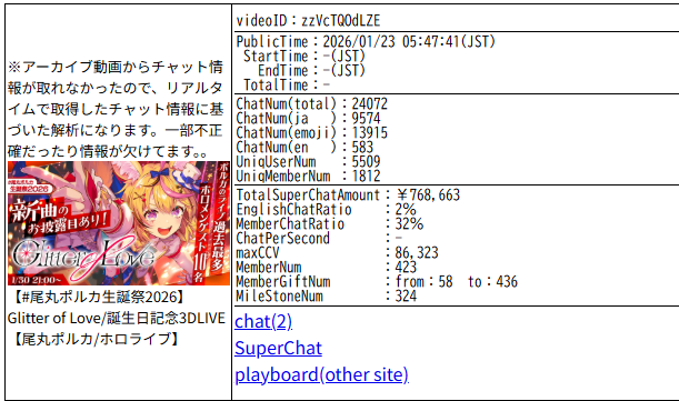 >>109053478Total (¥) is the sum of Superchat, Member*500, Member gift*500, and Twitch subs*700.
