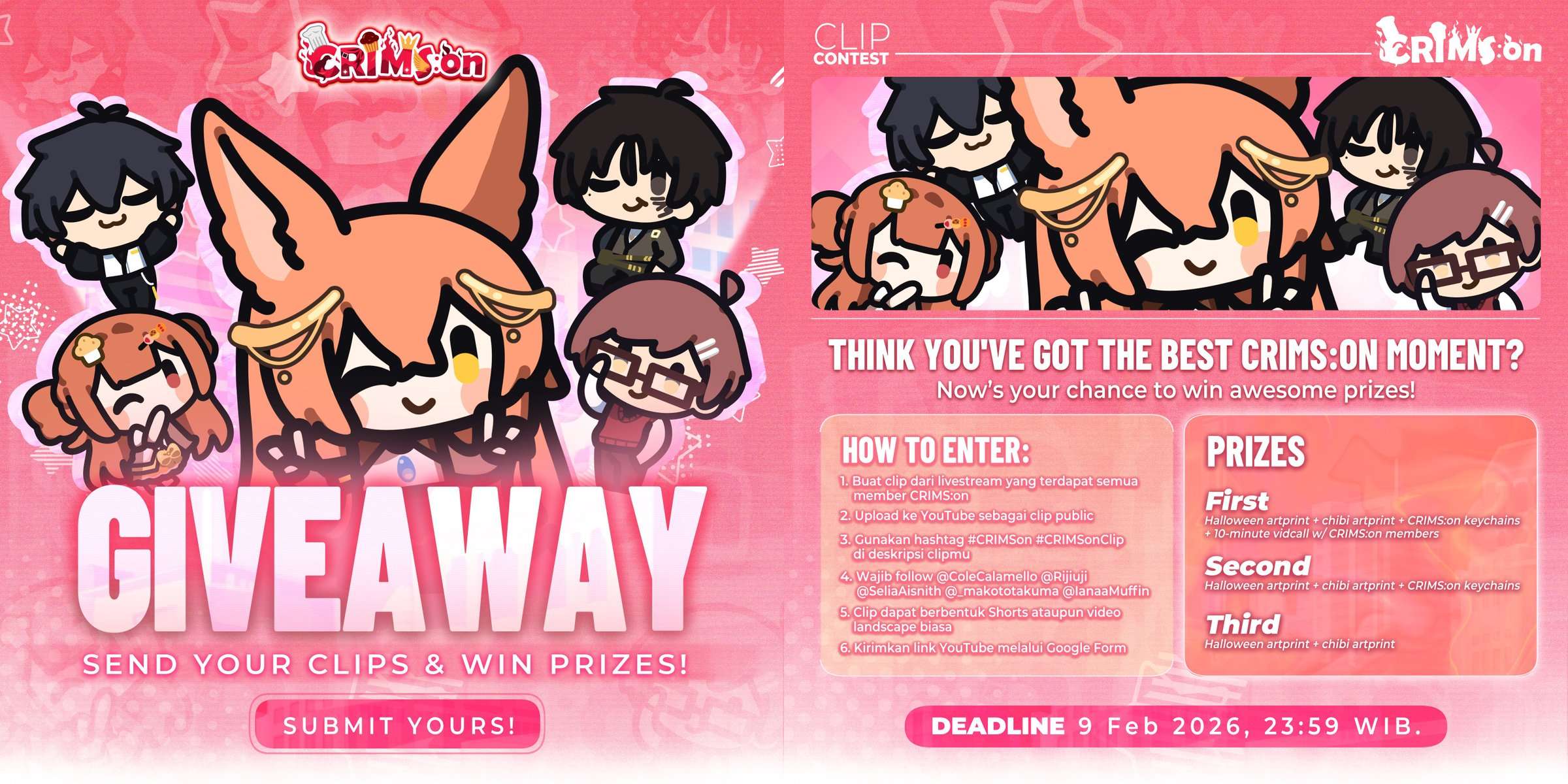 >>109061064>>109061251CRIMS:on also opens a giveaway event to celebrate their debut.https://x.com/AKAVirtualOnAir/status/2016813743934447643Fans can send clips and 3 lucky ones will win prizes such as artprint, keychain, and video callsThis event will be available until February 9th, and you can submit your entry in the following form:https://forms.gle/QS7wSuaNsUNZ2Htr9