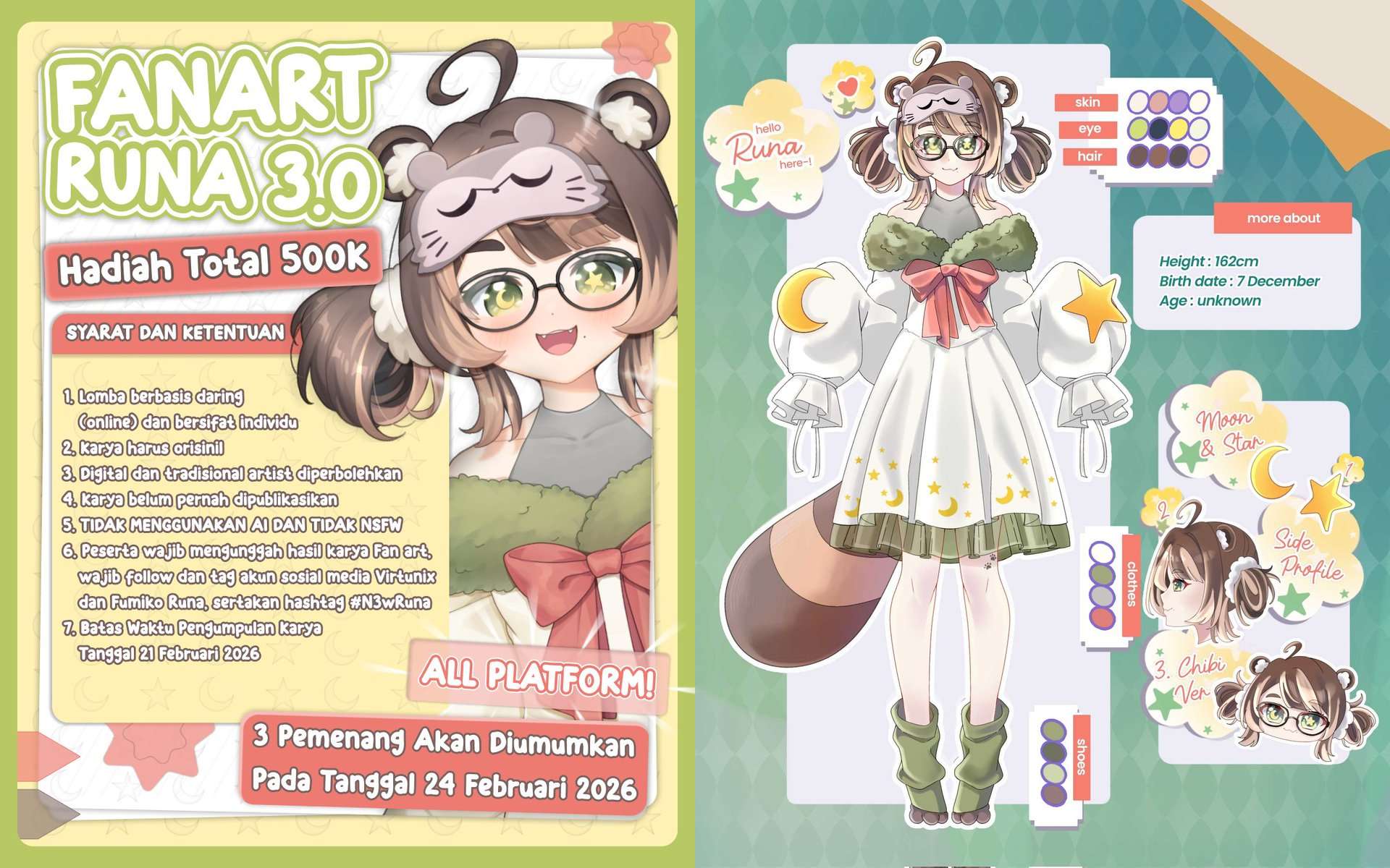 >>109061064Virtunix is doing a fanart contest to celebrate Fumiko Runa 3.0 debut, with total prizes of 500k Rupiah.https://x.com/virtunix/status/2017219440119865684Fans can participate by uploading their art to the any social media platform, tagging Virtunix SNS, and using the hashtag #N3wRuna. 3 winners will be announced on February 24th.