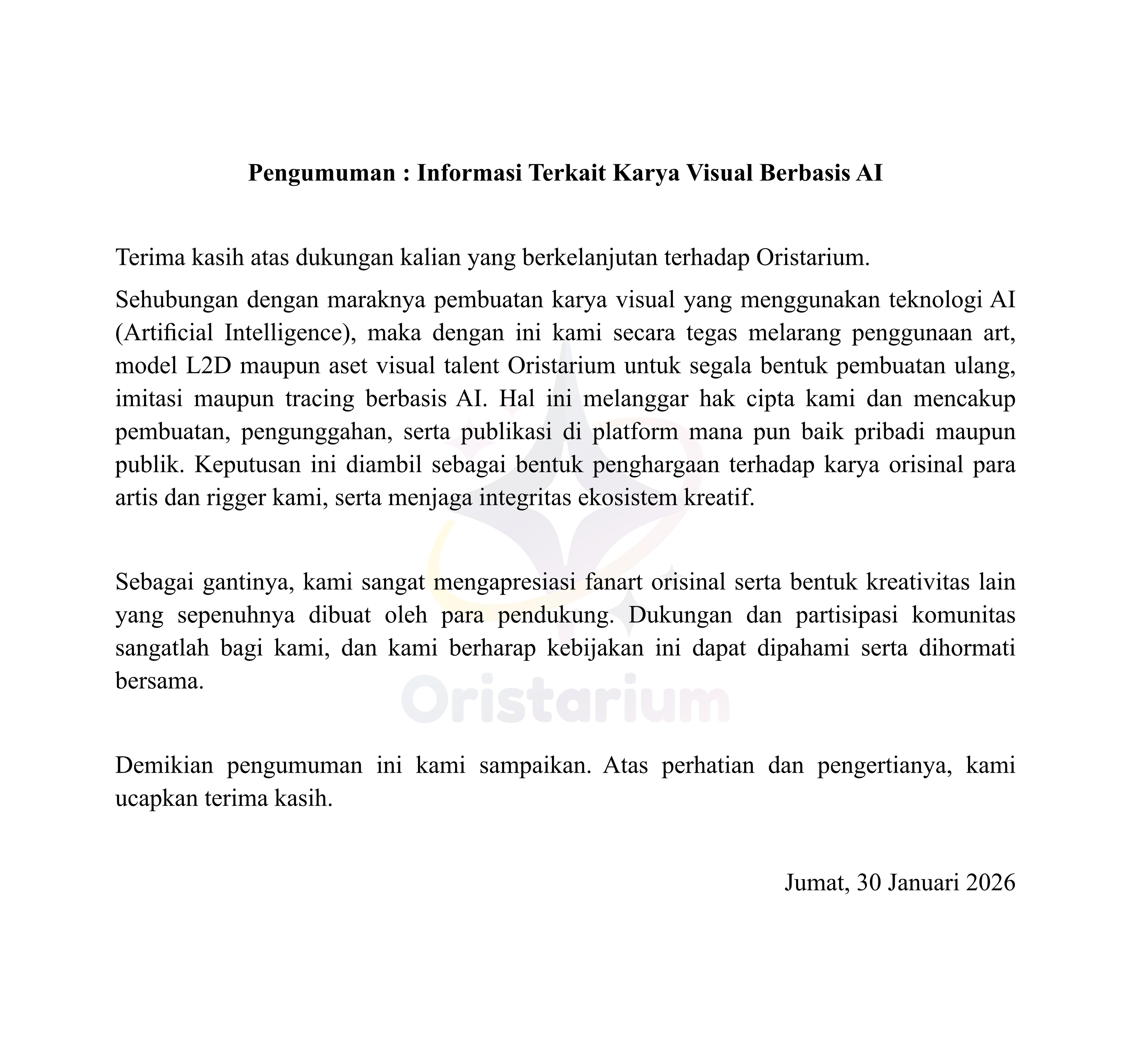 >>109061064Oristarium released a statement regarding of generative AI-based fanart.https://x.com/oristarium/status/2017144379182592396They prohibited the usage of official arts, assets, and L2D model to be replicated as a fanart with the assitance of generative AI technology.