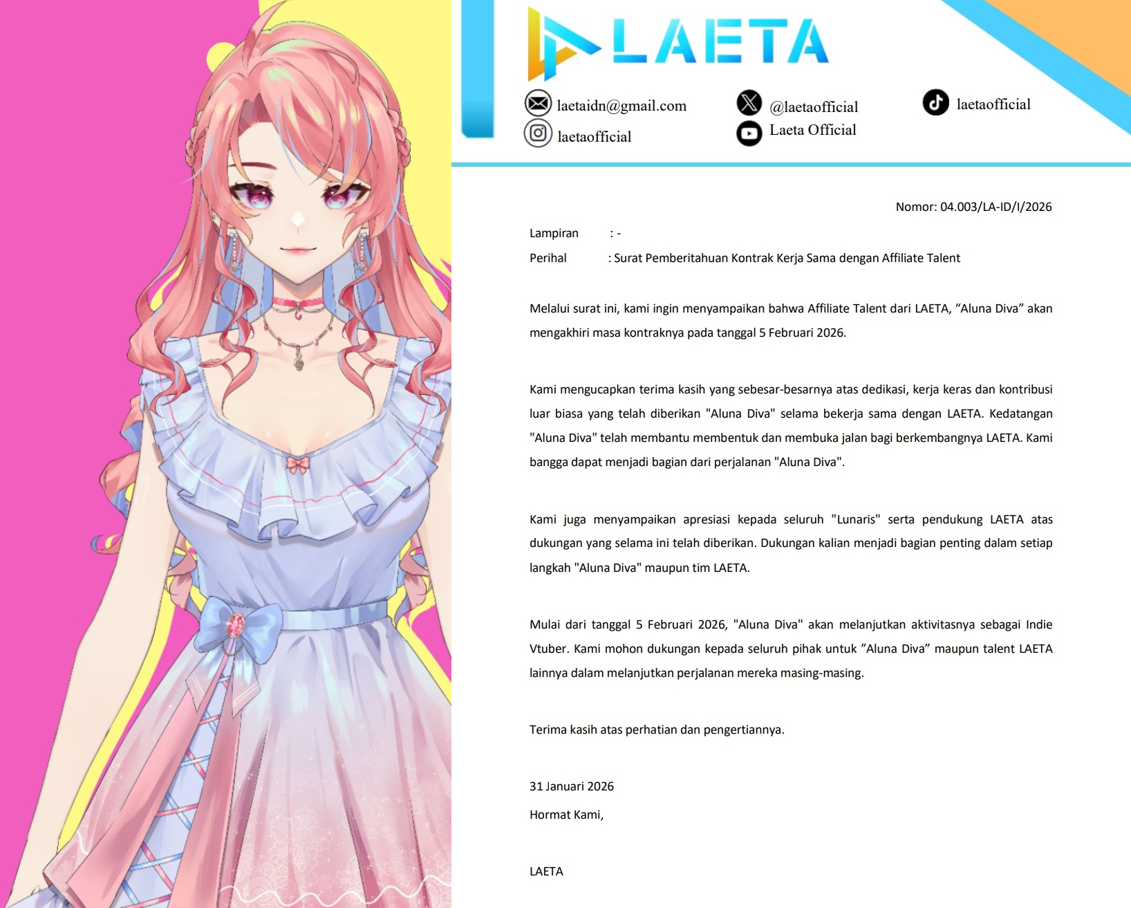 >>109061064Aluna Diva will be departing from LAETA on February 5th.https://x.com/laetaofficial/status/2017553360334045674She will continue her activities as an indie VTuber.