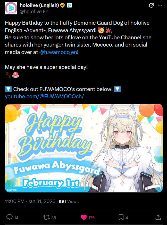 FWMC are the light of this world. EN Gold and Global Bronze for Fuwawa and Mococo Abyssgard's Birthday 3D Live celebration, Silver for Elizabeth Rose's unarchived karaoke, Bronze for Gigi Murin's playthrough of Arknights Endfield