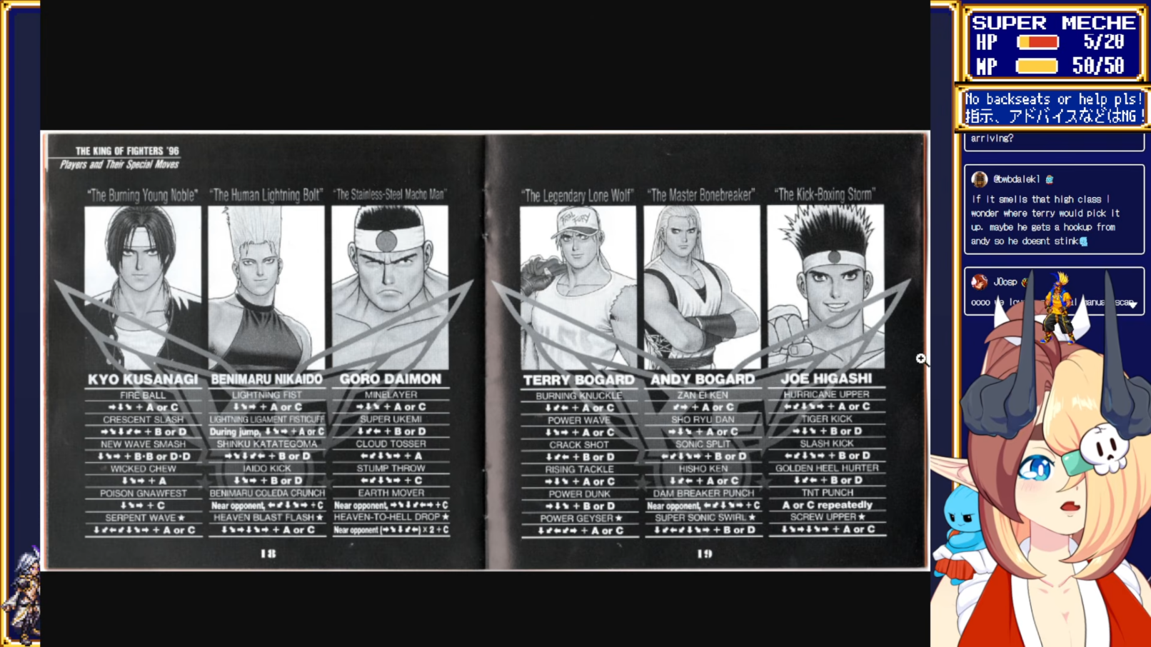 Meche is sniffing Terry in KOF '96https://www.youtube.com/watch?v=WVjxYZZZ5IMhttps://www.twitch.tv/supermeche