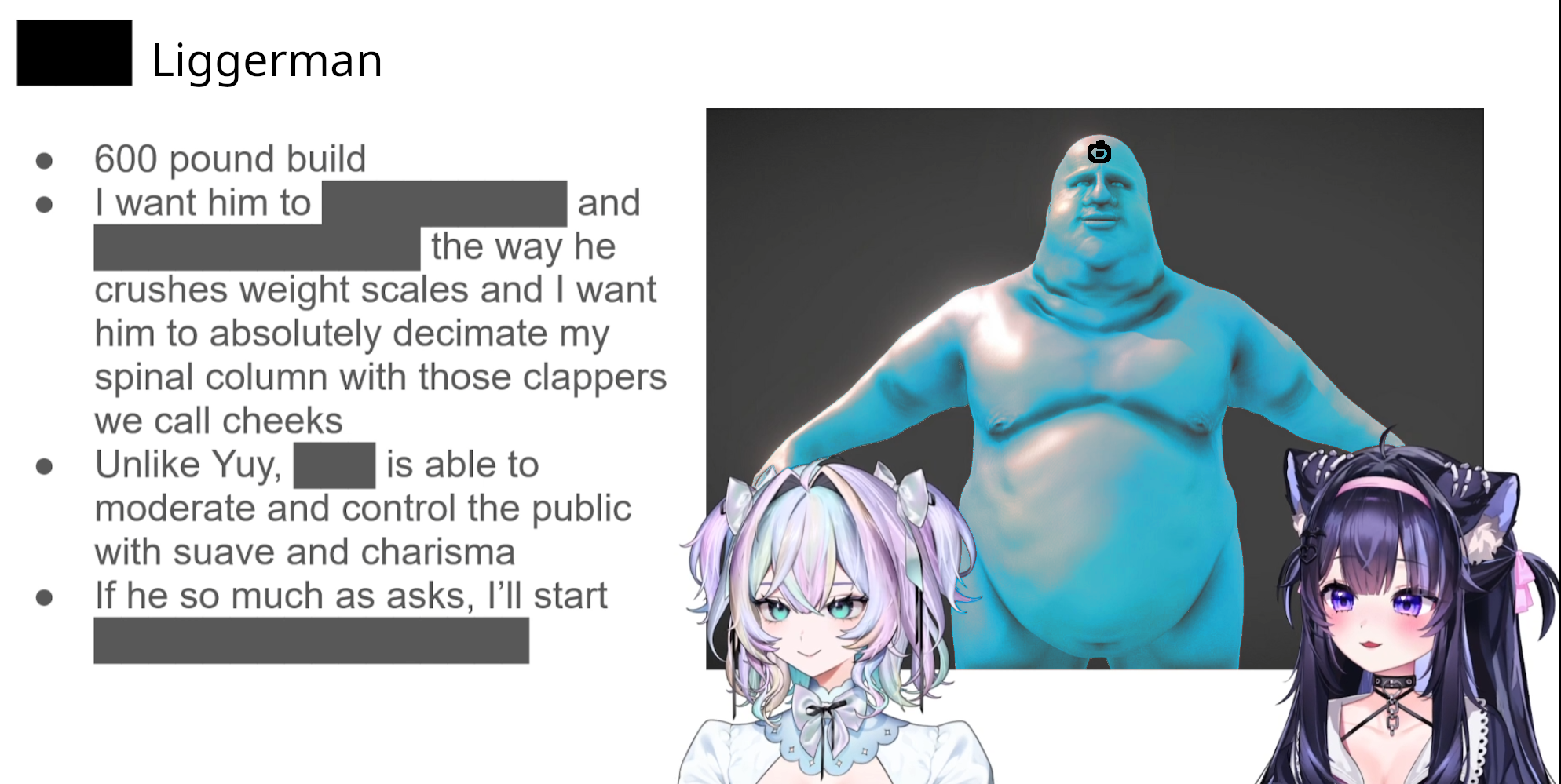 Fat fuck Edition>What is /lig/?/lig/ is a thread for viewers to find, share, and discuss indie vtubers who have on average 500 viewers or more.>Why /lig/?Large indie vtubers have more net fans, but they are outnumbered by 2views by the thousands. This is a thread for the VIP, regardless of what language they stream on.>Can I shill my 499view oshi here?Considering averages fluctuate widely, all the way down to 100 is reasonable. The minimal requirement however is being Twitch partner or the YouTube equivalent in numbers.>Wait isn't that one a corpo?/lig/ is a thread for chuubas of a decent size who aren't defined by their corporate branding, either due to the small size of the corporation or the independence and lack of oversight granted to the talents>/lig/ Numbershttps://lignumbers.neocities.org/>Twitch Clips Guidehttps://pastelink.net/34vd5>VOD Archival Guidehttps://rentry.org/Vod_Archival_Guide>/lig/ VOD Archivehttps://rentry.org/Indie_Vod_Archives_lig>Koikatsu cardshttps://mega.nz/folder/JYtkXJwL#07gAQCQqI_9FsmX9oQJKSA>/lig/ Wheel of Nameshttps://wheelofnames.com/5jh-93j>Tiermakerhttps://tiermaker.com/create/-lig--16586688-3>/lig/ Chuuba Birthday Calendar (WIP)https://www.canva.com/design/DAE-XgWodVg/ofLz4QC1yPPQ4T6TTAE0fw/edit?utm_content=DAE-XgWodVg>Upcoming BirthdaysFebruary 4th - Matara KanFebruary 5th - Bodega RatFebruary 9th - Meat & wwParasiFebruary 13th - KokonutsFebruary 14th - ReiyuguiguiFebruary 15th - SaaFebruary 18th - Moon JellyFebruary 22nd - HinaBoBinaFebruary 24th - SnuffyFebruary 27th - AsariMarch 6th - Lucy Pyre>OC material for the OPhttps://mega.nz/folder/IIVD1IaJ#cfsRhWdJvzneIoG8HZUPuw>/lig/booruhttps://ligbooru.moe/>Duckshttps://www.twitch.tv/dashducks (embed) (embed) (embed) (embed)Other useful threads:>>>/vt//big/>>>/vt//corpo/>>>/vt//choc/>>>/vt//flip/>>>/vt//haha/>>>/vt//indie/>>>/vt//mint/>>>/vt//swarm/>>>/vt//vrt/>>>/vt//xvsj+/Previous Thread: >>109065744