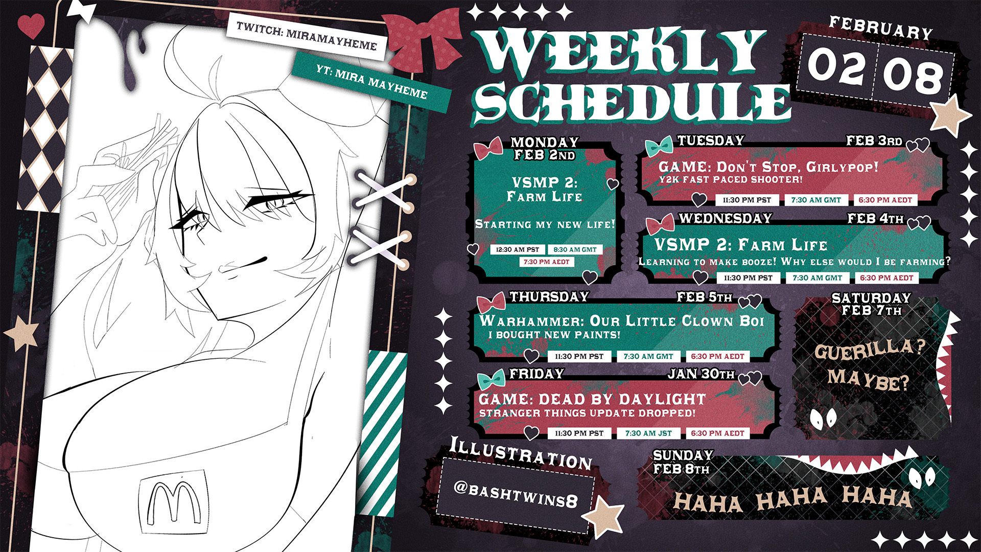 ><@&1400836782517522645> *ahem* updated! After much deliberation and not having enough time to progress my WIP project (I have half scripts, half songs, ideas). I've decided to take weekends off so I can work on projects and prep things! I have so many half started things and there's so much I want to do and make for the RingMasters! Also Members streams back next week <:love:1453817742376439879> Mama Clown has her tests this week to see how she's doing and to make sure nothing has come back, so I might be late to a couple of streams...FORGIVE ME! I AM NOT WORTHY! Updated Mira's schedule (from discord)She also live https://www.youtube.com/live/DPKge9_nHew