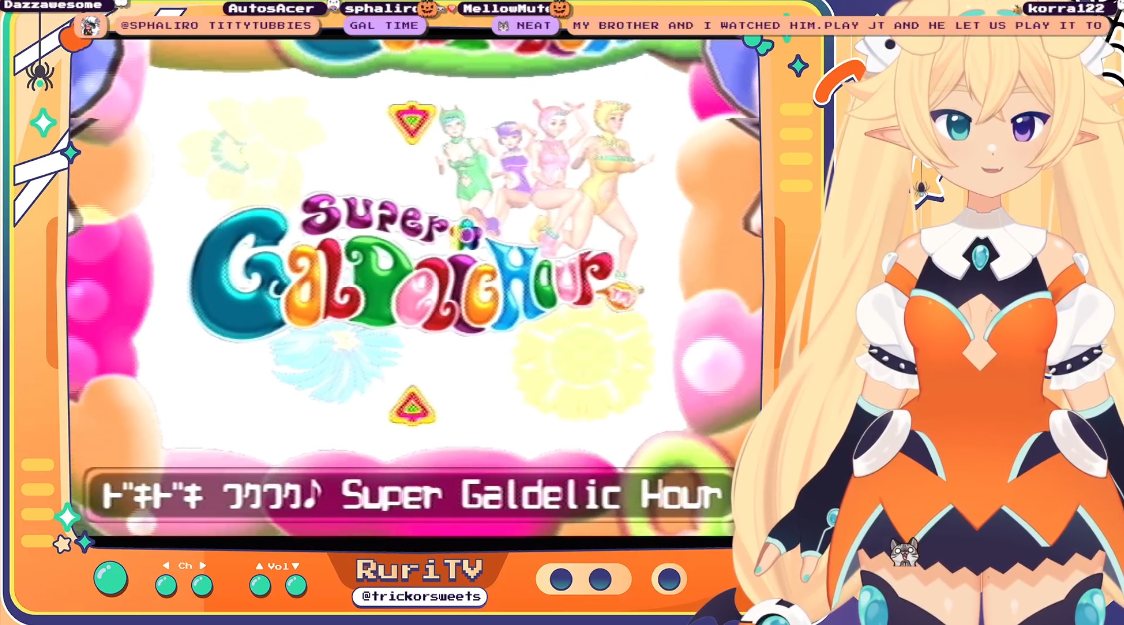 Ruri was spares from that weird frogger game and is playing super galdelic hour to finish out the stream. Its that weird game Mono played a couple weeks ago.