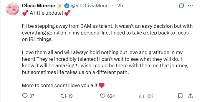 Olivia Monroe is leaving 3am and now 3 other people also left 3amDisbandment soon?https://x.com/VT_OliviaMonroe/status/2018898245263761801