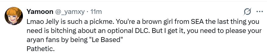 Stop pretending like Jelly isn't looking for blood, it's the absolute only reason that she posted that on twitter.Jelly wants to be a chud and she should expect to get antis obviously that's how the gimmick work.You give your opinion people agree or disagree it creates engagement, it increases visibility it createx fanatics, it's what they call grifting.