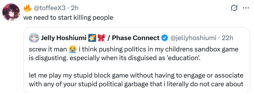 >>109144637Big doubt. She didn't even say anything wrong either and we've seen all day that it's political tourists that don't even watch vtubers let alone vtuber supporters that support phase. Like holy shit the retard crying that they'll change their jelly pfp didn't have a single tweet about jelly prior.