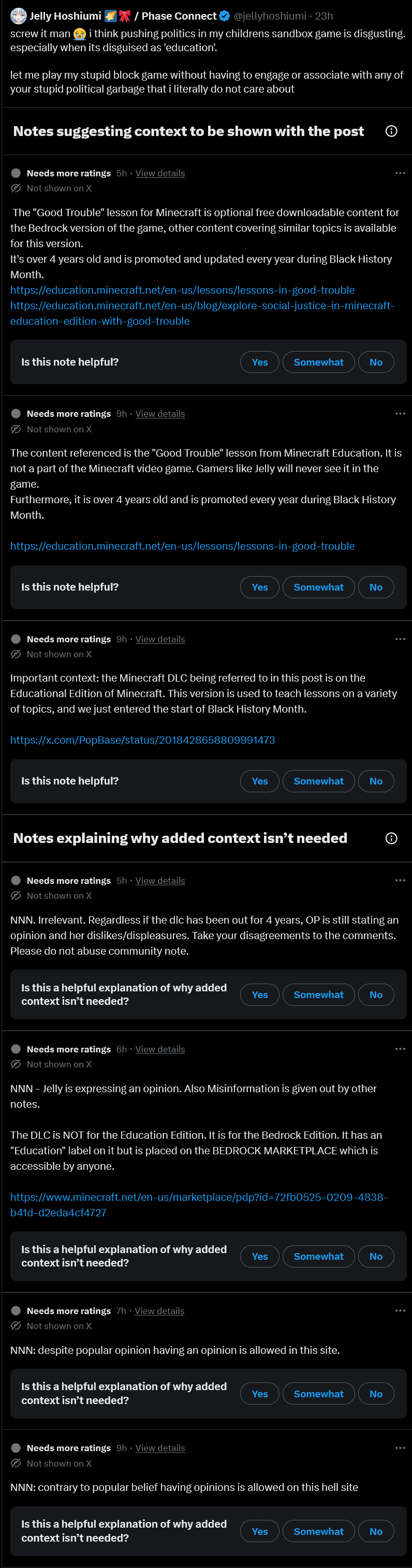 >>109142219That's because dumbasses assumed the worst and thought it was coded language saying that black don't deserve their rights when all Jelly was saying was "keep real life out of block game"