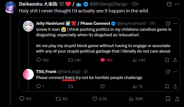 >>109144221>Everyone's jumping on Jelly for this braindead, if not dangerous take for Phase Connect.The braindead take being that corporations shouldn't have political opinions, and shouldn't be trying to cash in on the misery or history that doesn't belong to them?