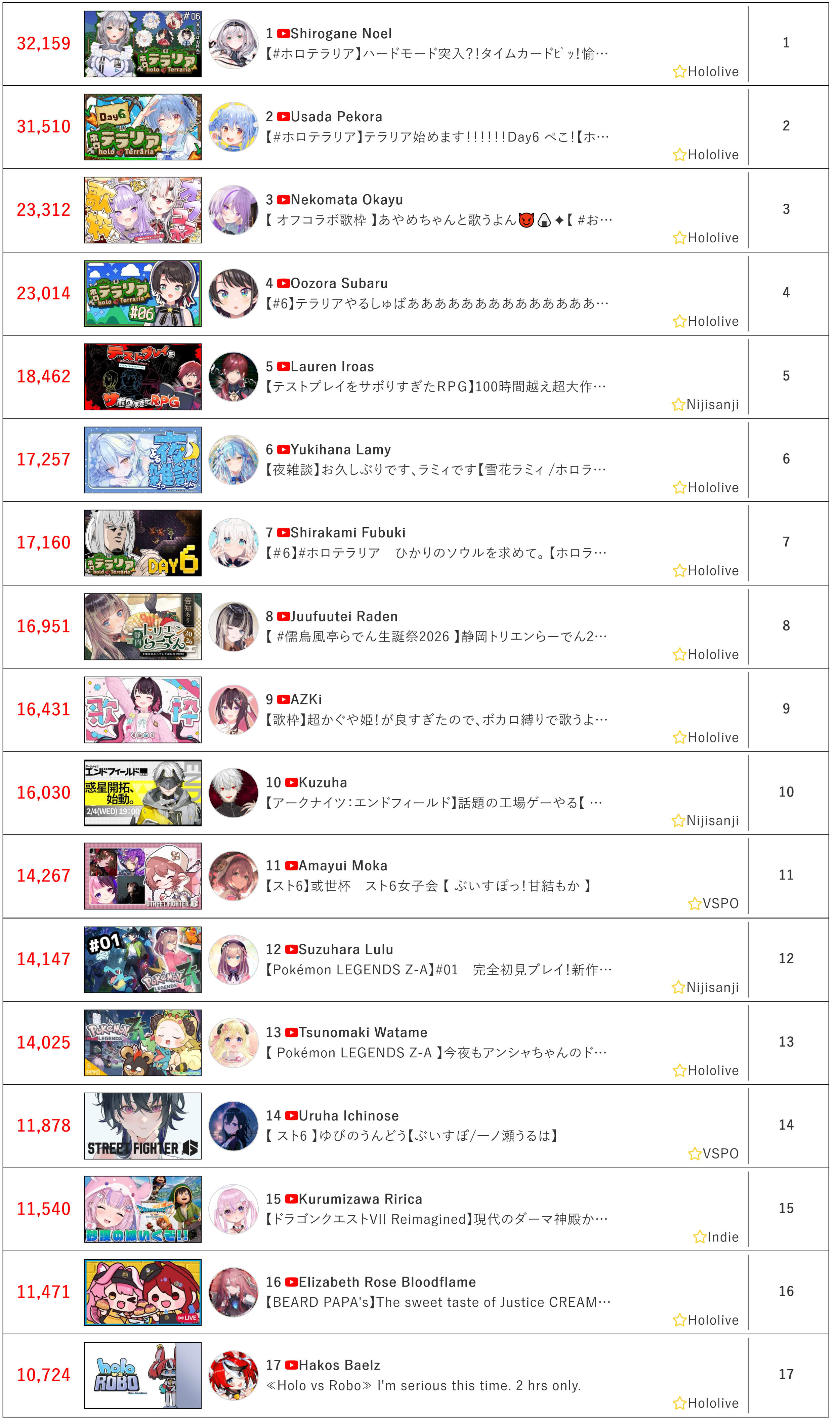 * FINAL TALLY OF THE DAY IS IN *Here it goes>32,159: Noel (Hololive)>31,510: Pekora (Hololive)>23,312: Okayu (Hololive)>23,014: Subaru (Hololive)>18,462: Lauren (Nijisanji)>17,257: Lamy (Hololive)>17,160: Fubuki (Hololive)>16,951: Raden (Hololive)>16,431: AZKi (Hololive)>16,030: Kuzuha (Nijisanji)>14,267: Moka (VSPO)>14,147: Lulu (Nijisanji)>14,025: Watame (Hololive)>11,878: Nose (VSPO)>11,540: Ririca (Indie)>11,471: Elizabeth (Hololive)>10,724: Bae (Hololive)Gold for Noel with Terraria, Pekora getting silver with the same game and Okayu, bronze