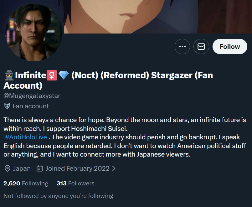 >>109153438Use a sub account for any stuff like that, your main should be for your oshi and posting a smug hologirl pic followed by the words>hologods keep winningwhen some other corpo has a yab like this
