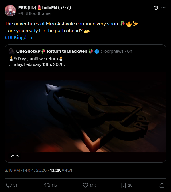 *FEBRUARY 4TH 2026 FINAL EN TALLY*>11,471: Elizabeth (Hololive English)>10,724: Baelz (Hololive English)>9,475: Raora (Hololive English)>9,009: Shiori (Hololive English)>8,232: Cecilia (Hololive English)>7,176: Nimi (Indie)>6,546: Ina'nis (Hololive English)>5,893: Gigi (Hololive English) Well look who it is. Gold for Elizabeth Rose's sponsorship zatsu (alongside Raora), Silver for Hakos Baelz's playthrough of Holo vs Robo, Bronze for Raora Panthera's playthrough of Powerwash Simulator 2 alongside Kronii.TRIVIA: Excluding special events (Outfit Reveal and Holonatsu), this is the first time that all members of Hololive English Justice qualify for the tally since June 1st.>RANKING PER POINTS (Gold = 3, Silver = 2, Bronze = 1)Baelz = 8pElizabeth = 5pFUWAMOCO = 4pNimi, Bijou = 2pGigi, Kiara, Raora = 1p