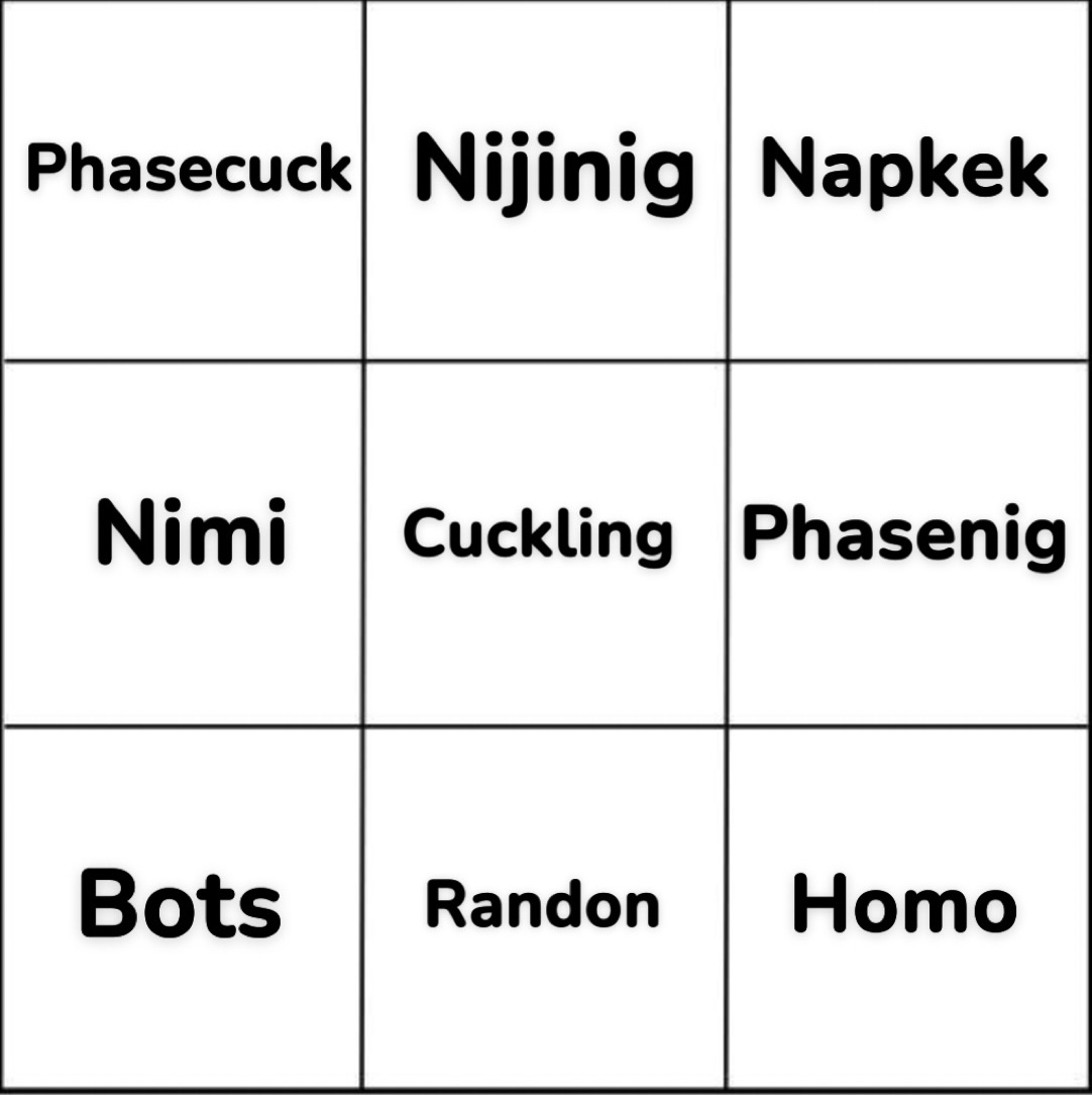 >>109153353just make a 3x3 bingo then. explain at the bottom that it's a 3x3 instead of 5x5 because it's just that boring.