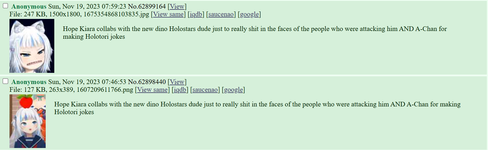 >>109153384>>109153494>>109153502I have said it before. They are trying to get Hololive to have a feud with the chudsphere.