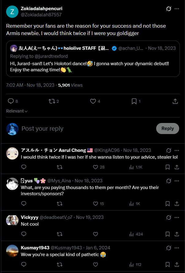 >>109159506>https://x.com/achan_UGA/status/1725675211193041290I'm reading through the replies and none of them actually watch holo. It's pathetic kek