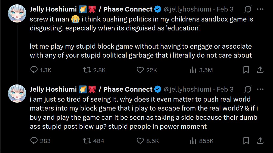 >Pippa says she supports LGBT people and denounces the chud audience>Jelly undoes all the backpedaling and knee bending just to bitch about an optional mod for bedrock