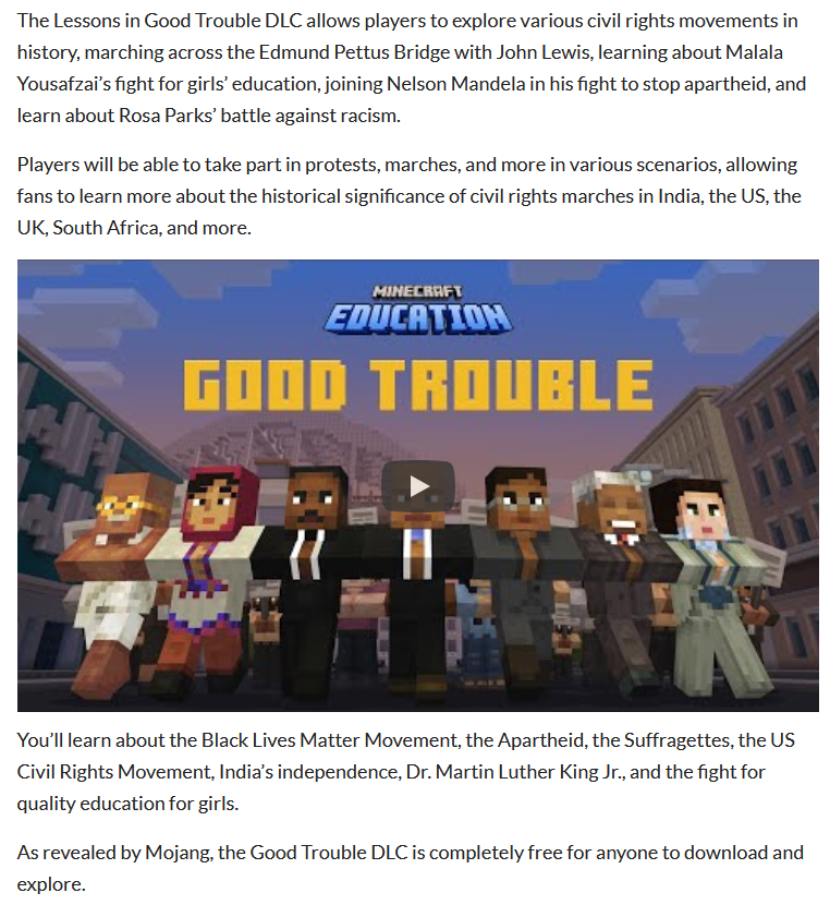 >>109157367Minecraft put out a history education pack about nonviolent protests throughout history and across the world. Shit like GhandiIt had some black people on it so Jelly flipped out and it broke containment.