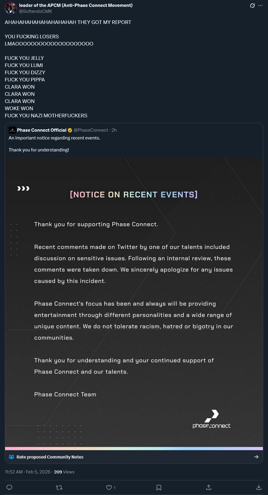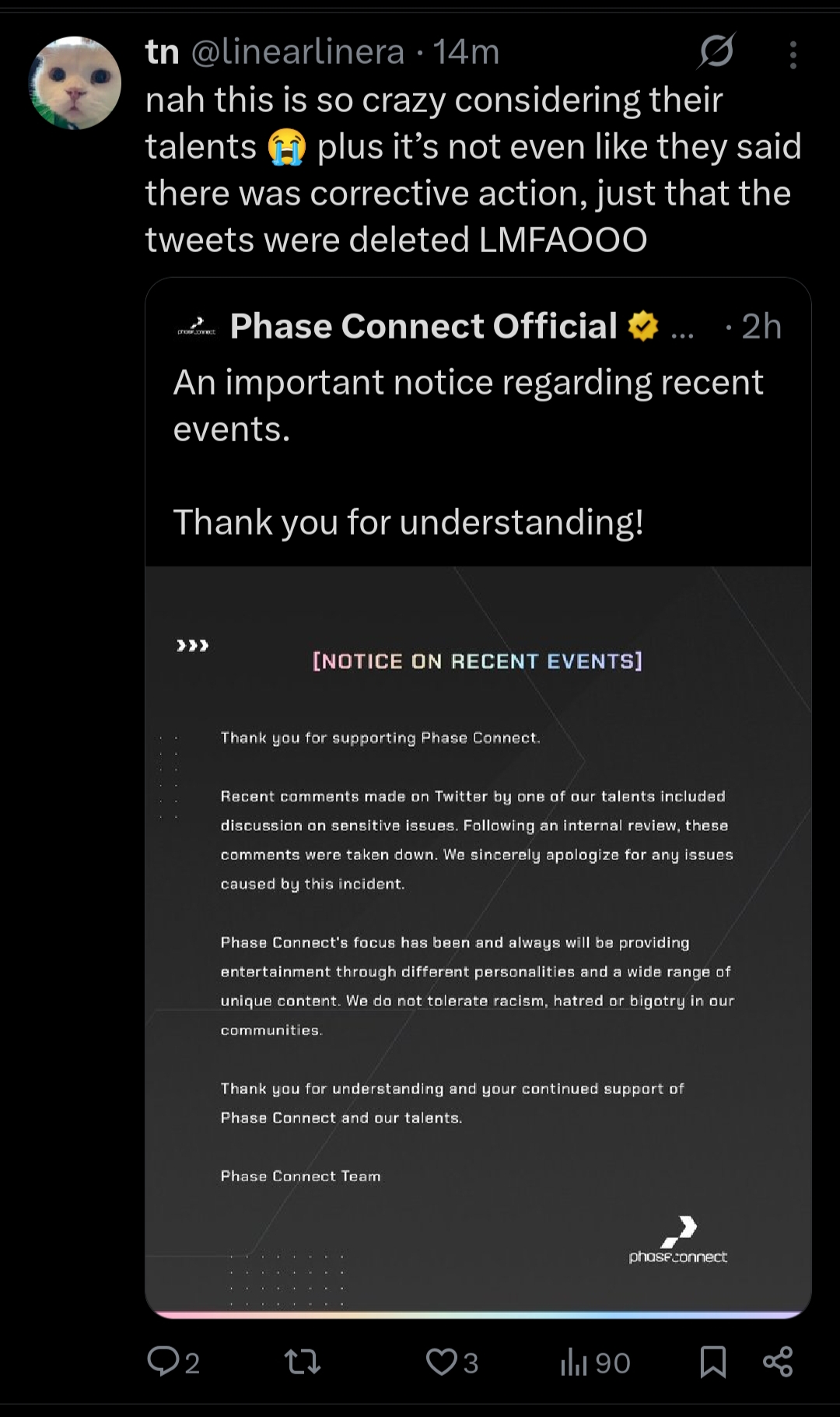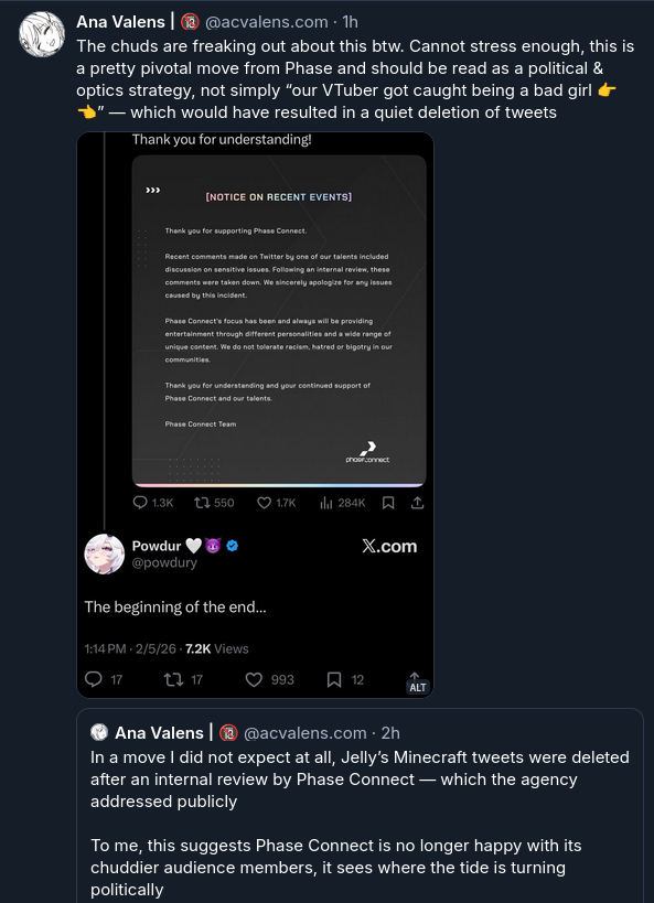 I do get a weird sense of satisfaction out of seeing all the seething about this decision from the same people that wanted Clara doxxed and terminated, even if Phase throwing Jelly under the bus was completely unnecessary when just deleting the post would have let this all be memory holed eventually.