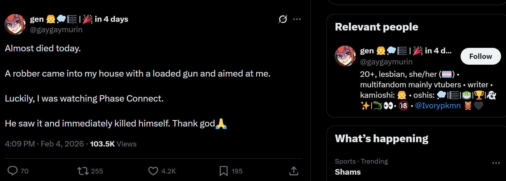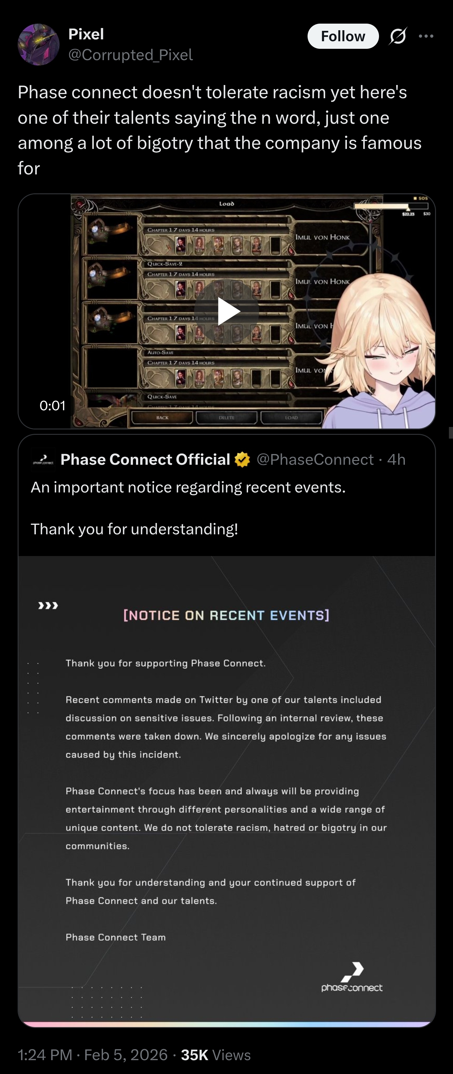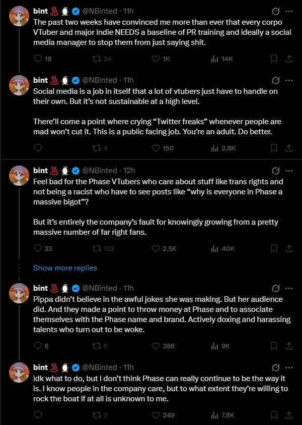 >>109185812>Talent says TND dogwhistle on her official corpo account>Expects there to be no consequences This is by far the biggest yab in Phase's history. If anyone itt had an official corporate spokesman Twitter and said what she said on it, he'd instantly be fired.