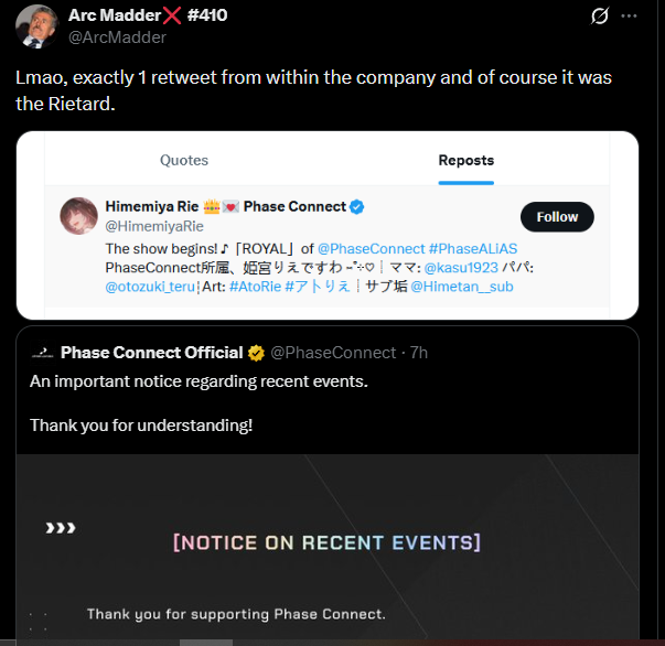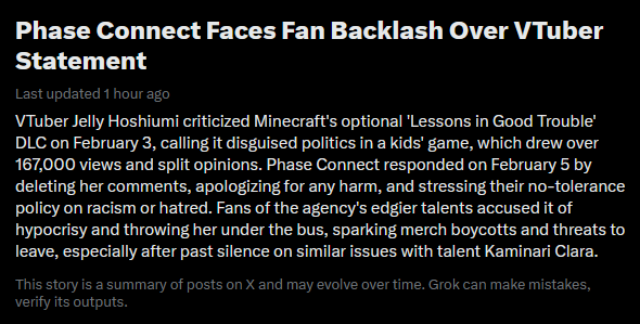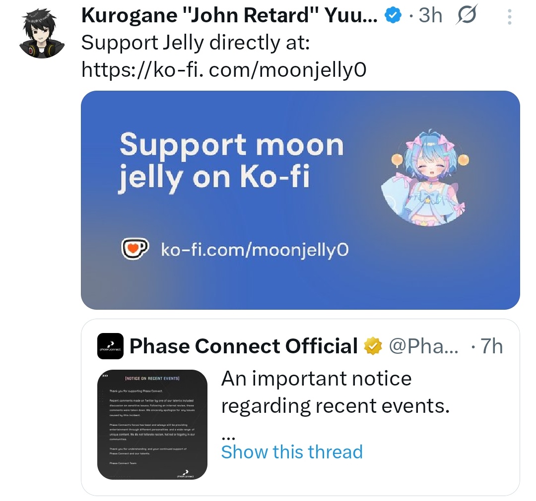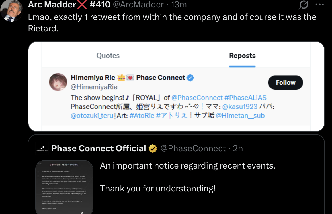 I don't really understand what the problem is, one side says1. Wow Phase connect you should defend your talents no matter what, don't bend your fucking knees2. This is correct phase, you gotta be in the right side at the right times, you should get support racism and bigotry.Like, does anyone else think it's the talents fault here and the company won't support everything your fucking do alright, if you are a dumpster fire of a human being why would any sane person protect you