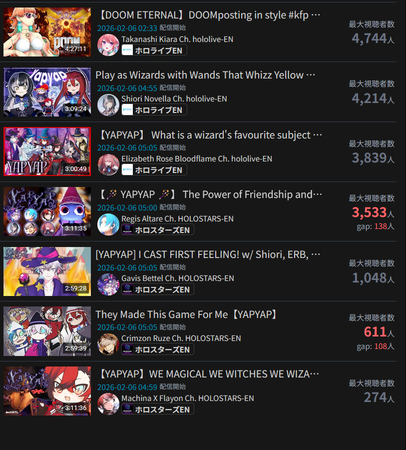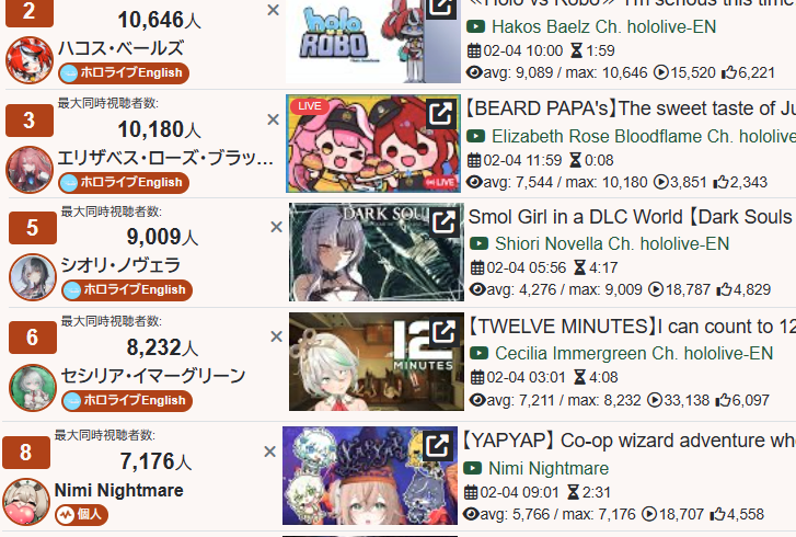 >>109192665A lot of people who crow about whatever thing they like beating Hololive EN don't have a grasp of numbers and don't understand the scale of the difference between HoloEN and any western competition. It's really just funny