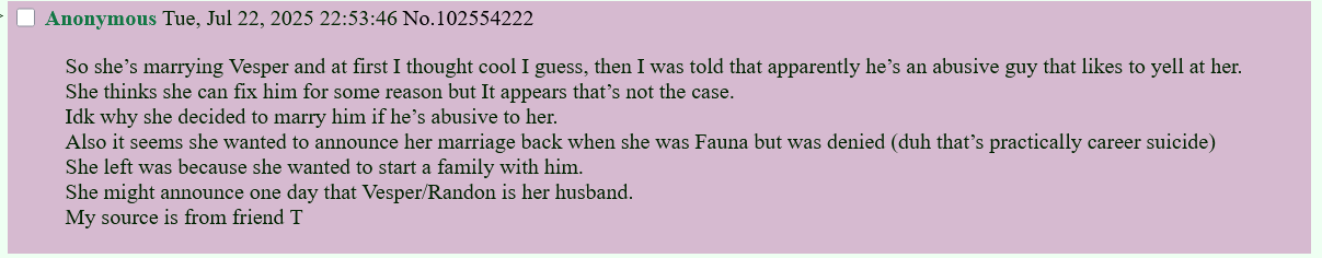 >>109192705>>109192687Ehh, that’s not enough to convince me desu. Enough schizos write crazy shitposts all the time that it doesn’t seem odd to me that this was just a random shot in the dark that got lucky. I just hope we can all agree that domestic abuse is a real line we’d never cross. Even if you hate her wishing that on someone makes me sick. No one deserves to be hit
