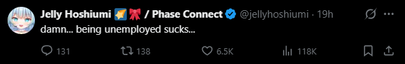 >>109191470if jelly leaves phase invaders as a whole will probably mass graduate, dizzy has stated as such, she has no love for phase connect if it wasn't for the invaders