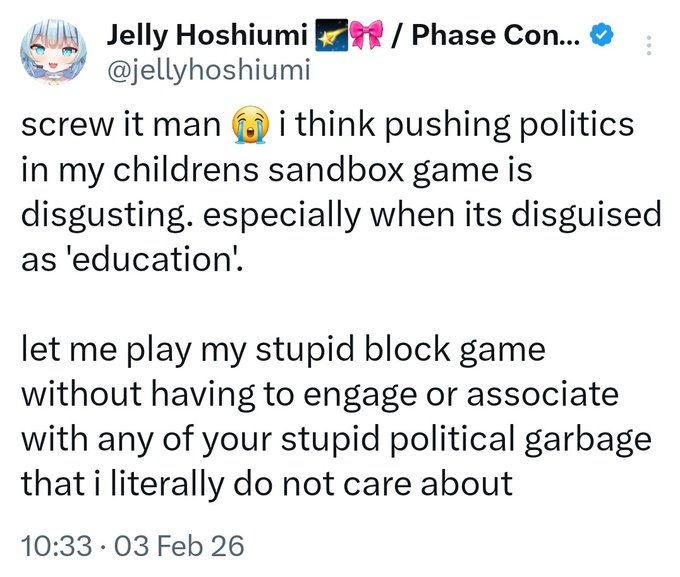 >>109202730How did Jelly give such a basic take about how block games shouldn't be used to push politics to this? Like the tweet had like 1000 likes when I saw it how did it snowball to this?