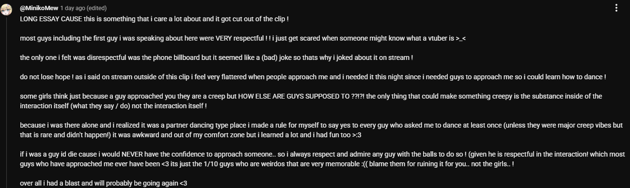 >>109215433Eh, that was the thing that really got the ball rolling, but even before that things started when it got extremely obvious in the last few days of the second subathon that Mini was going full horny for Vedal. I would say the thing that distinguishes Minidal theories is that they're basically unproveable in both directions. No one has plausibly suggested another reason for the Mini unfollows for example, and Mini right this second moving to the UK is also quite difficult to explain. Not that people don't try but none of it sticks. Personally I don't watch Mini or ship her or care about her really, but her hooking up with Vedal even just on a temporary basis is not an implausible outcome, really.