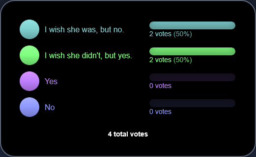 >>109220930Where's the "i really wish she was going for him but i know to not buy too much into shipfag troonery so i don't get dissapointed when it's revealed she just liked uk or something" option?