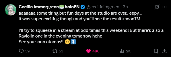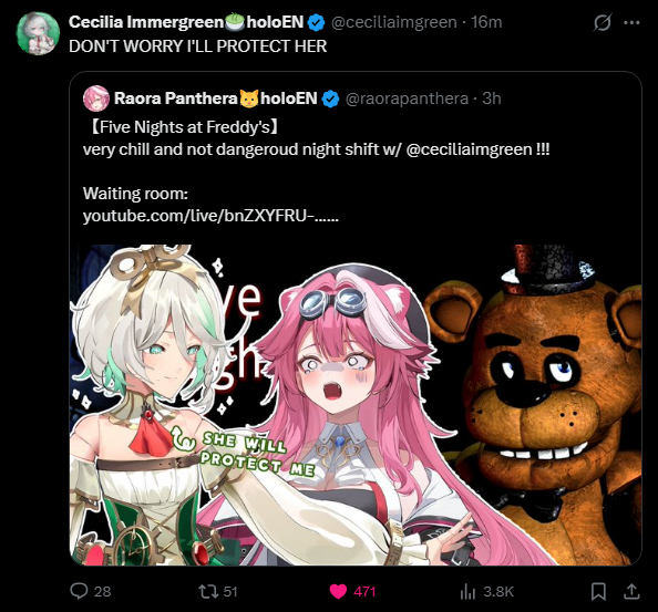 >Cecilia "too busy to stream for you" immergreen joins every stream at any time >4am group collab as predicted>collabspam starting againGreat news to wake up to. Next week will be worse