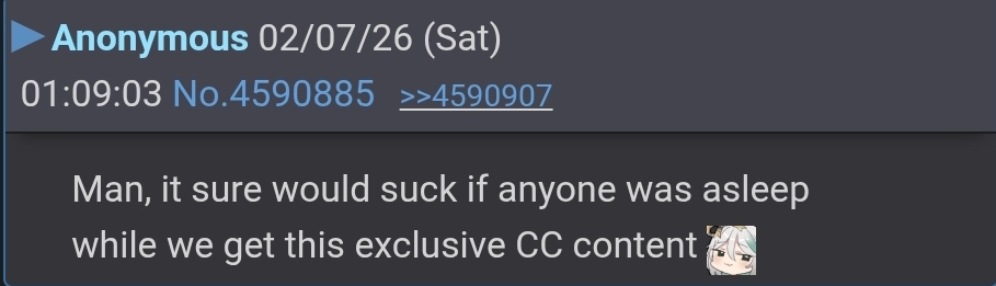I just remembered I had a dream where CC was collabing with some minor male vtuber and the thread was full of shit meanwhile I was like "oh, okay at least thread is full of rage; fun"