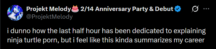 >>109222765Her music is now more succesful than any other vtuber's. It dwarfs most of them combined. And that's only one aspect of her career. If that's a fall off, what would success even look like?