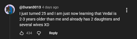 >>109229451Neuro said vedal was 27 in the camilla tea time collab during the subathon and vedal and camilla rolled with it, some swarmies now think that was genuine