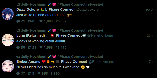 ▼ Phase Connect LinksOfficial Website: https://phase-connect.comOfficial Schedule: https://schedule.phase-connect.comOfficial Twitter: https://x.com/PhaseConnect | https://x.com/PhaseConnectJPOfficial Character References: https://rentry.org/pcgreferencesOfficial Twitch Archive Channels: https://rentry.org/pcgtwitcharchiveUnofficial Phase Connect Archives: https://rentry.org/pcgunofficialarchive––––––––––––––––––––––––––––––––––◆【Lia】https://x.com/rinkouashelia | https://youtube.com/RinkouAshelia | https://twitch.tv/asheliarinkou◆【Utatane Nasa】転寝ナサ (JP) https://x.com/UtataneNasa | https://youtube.com/UtataneNasa | https://twitch.tv/utatanenasa◆【Hakushika Iori】白鹿いおり (JP + EN) https://x.com/hakushikaiori | https://youtube.com/HakushikaIori | https://twitch.tv/iorihakushika◆【Fujikura Uruka】https://x.com/fujikurauruka | https://youtube.com/FujikuraUruka | https://twitch.tv/fujikurauruka◆【Shisui Michiru】紫翠みちる (JP) https://x.com/shisuimichiru | https://youtube.com/ShisuiMichiru | https://twitch.tv/michiru_shisui◆【Tenma Maemi】https://x.com/tenmamaemi | https://youtube.com/TenmaMaemi | https://twitch.tv/tenma◆【Pipkin Pippa】https://x.com/pipkinpippa | https://youtube.com/PipkinPippa | https://twitch.tv/pippa––––––––––––––––––––––––––––––––––◆【Kaneko Lumi】https://x.com/kaneko_lumi | https://youtube.com/KanekoLumi | https://twitch.tv/kanekolumi◆【Fuura Yuri】[Terminated] https://x.com/AmarisYuri | Archive: https://youtube.com/@TheNationalFuuraYuriArchive◆【Dizzy Dokuro】https://x.com/dizzydokuro | https://youtube.com/@dizzydokuro | https://twitch.tv/dizzydokuro◆【Jelly Hoshiumi】https://x.com/jellyhoshiumi | https://youtube.com/@jellyhoshiumi | https://twitch.tv/jellyhoshiumi◆【Ember Amane】https://x.com/emberamane | https://youtube.com/@EmberAmane | https://twitch.tv/emberamane◆【Clio Aite】https://x.com/ClioAite | https://youtube.com/@ClioAite | https://twitch.tv/clioaite◆【MariMari_en】https://x.com/MARIMARI_EN | https://youtube.com/@MARIMARI_EN | https://twitch.tv/marimari_en◆【Eepy Sleepy】https://x.com/EepySleepyCh | https://youtube.com/@EepySleepyCh | https://twitch.tv/EepySleepy––––––––––––––––––––––––––––––––––◆【Remilia Nephys】https://x.com/Remilia_Nephys | https://youtube.com/RemiliaNephys | https://twitch.tv/remilianephys◆【Chisaka Airi】https://x.com/ChisakaAiri | https://youtube.com/ChisakaAiri | https://twitch.tv/chisakaairi◆【Amanogawa Shiina】https://x.com/AmanogawaShiina | https://youtube.com/AmanogawaShiina | https://twitch.tv/amanogawashiina◆【Himemiya Rie】https://x.com/HimemiyaRie | https://youtube.com/HimemiyaRie | https://twitch.tv/himemiyarie◆【Erina Makina】https://x.com/ErinaMakina | https://youtube.com/ErinaMakina | https://twitch.tv/erinamakina◆【Komachi Panko】https://x.com/komachipanko | https://youtube.com/KomachiPanko | https://twitch.tv/komachipanko––––––––––––––––––––––––––––––––––◆【Runie Ruse】https://x.com/RunieRuse | https://youtube.com/@RunieRuse | https://twitch.tv/RunieRuse◆【Eimi Isami】https://x.com/eimiisami | https://youtube.com/@eimiisami | https://twitch.tv/eimiisami◆【Muu Muyu】https://x.com/Muu_Muyu | https://youtube.com/@MuuMuyu | https://twitch.tv/MuuMuyu◆【Hikanari Hina】https://x.com/HikanariHina | https://youtube.com/@HikanariHina | https://twitch.tv/HikanariHina◆【Saya Sairroxs】[Graduated] https://x.com/sayasairroxs | https://youtube.com/@sayasairroxs | https://twitch.tv/sayasairroxs––––––––––––––––––––––––––––––––––◆【Kannagi Loki】巫ロキ (JP) https://x.com/kannagiloki | https://youtube.com/@kannagiloki ◆【Kokoromo Memory】[Graduated] https://x.com/kokoromomemory | https://youtube.com/@kokoromomemory_ | https://twitch.tv/kokoromomemory◆【Gram Pico】倉夢ぴこ (JP) https://x.com/grampico_ | https://youtube.com/@grampico | https://twitch.tv/grampico◆【Ayase Yuu】絢世ユウ (JP) https://x.com/ayaseyuuu | https://youtube.com/@ayaseyuu | https://twitch.tv/ayaseyuu_◆【Kaminari Clara】歌美鳴クララ (EN + JP) https://x.com/kaminariclara_ | https://youtube.com/@kaminariclara | https://twitch.tv/kaminariclara––––––––––––––––––––––––––––––––––◆【Malice Evermore】https://x.com/MaliceEvermore | https://youtube.com/@maliceevermore | https://twitch.tv/maliceevermore◆【Nitya Nil】https://x.com/Nitya_Nil | https://youtube.com/@Nitya_Nil | https://twitch.tv/nitya_nil◆【Wilhelmina Frost】https://x.com/wilhelminafr0st | https://youtube.com/@wilhelminafrost | https://twitch.tv/wilhelminafrost◆【Bibi Biscuit】https://x.com/BibiBiscuitCh | https://youtube.com/@bibibiscuitch | https://twitch.tv/bibibiscuitch◆【Anya Nyabyss】https://x.com/AnyaNyabyss | https://youtube.com/@AnyaNyabyss | https://twitch.tv/anyanyabyss◆【Sinon Sinfonia】https://x.com/SinonSinfonia | https://youtube.com/@SinonSinfonia | https://twitch.tv/sinonsinfoniaPrevious Thread: >>109229688